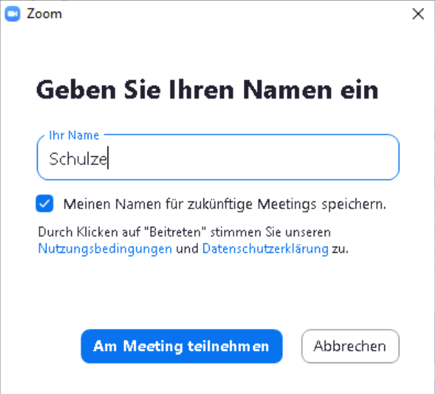 Nach Klick auf „Zoom öffnen“ geben Sie Ihren Namen ein und betreten das Meeting.