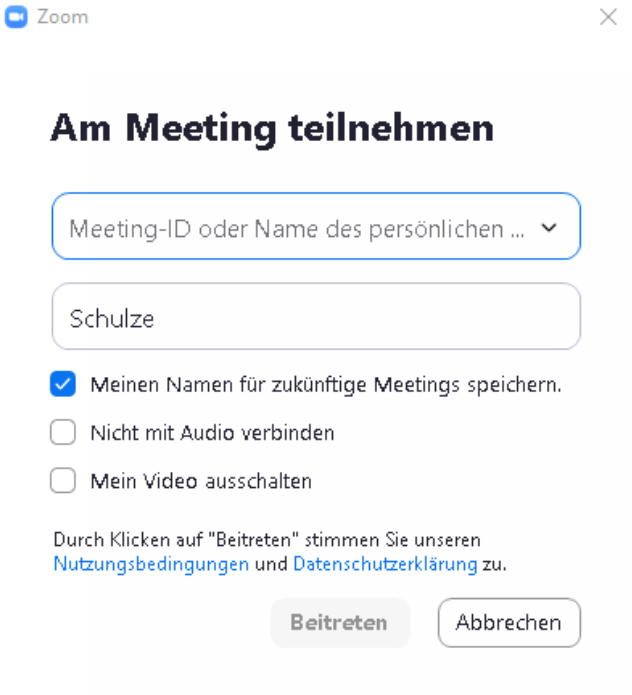 Im folgenden Fenster geben Sie die Meeting-ID und Ihren Namen ein.