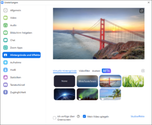 Mit der Schaltfläche „Video beenden“ unterbrechen Sie die Videoübertragung. Es wird dann nur Ihr Name angezeigt. Über den Pfeil rechts daneben wählen Sie eine Ihrer vorhandenen Kameras aus und können einen virtuellen Hintergrund wählen. Diese Smart-Hintergründe müssen einmal heruntergeladen werden.