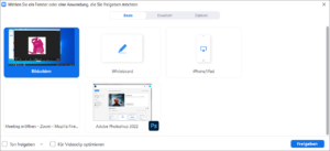 Solange kein anderer Bildschirm freigegeben ist, können Sie mit der Schaltfläche „Bildschirm freigeben“ den anderen Teilnehmern und dem Trainer Ihren Bildschirm zeigen. Sie bekommen eine Auswahl von Fenstern, die Sie teilen können. Unter anderem auch ein Whiteboard für Skizzen.